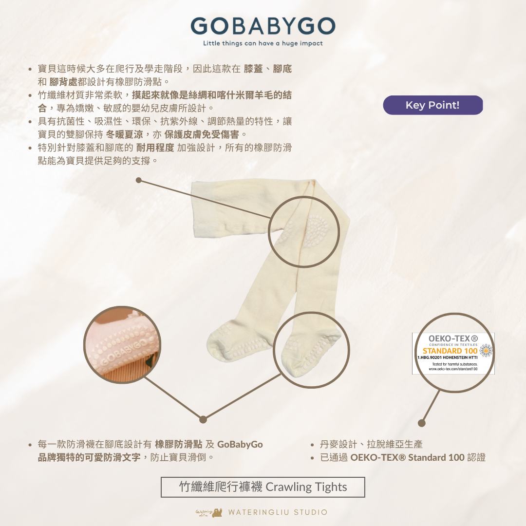 GoBabyGo 竹纖維爬行褲襪在膝蓋、腳底和腳背處都有特殊設計的橡膠防滑點,確保孩子在開始爬行和行走時不會輕易在光滑的表面上滑倒,為寶貝在所有表面上提供穩定性。