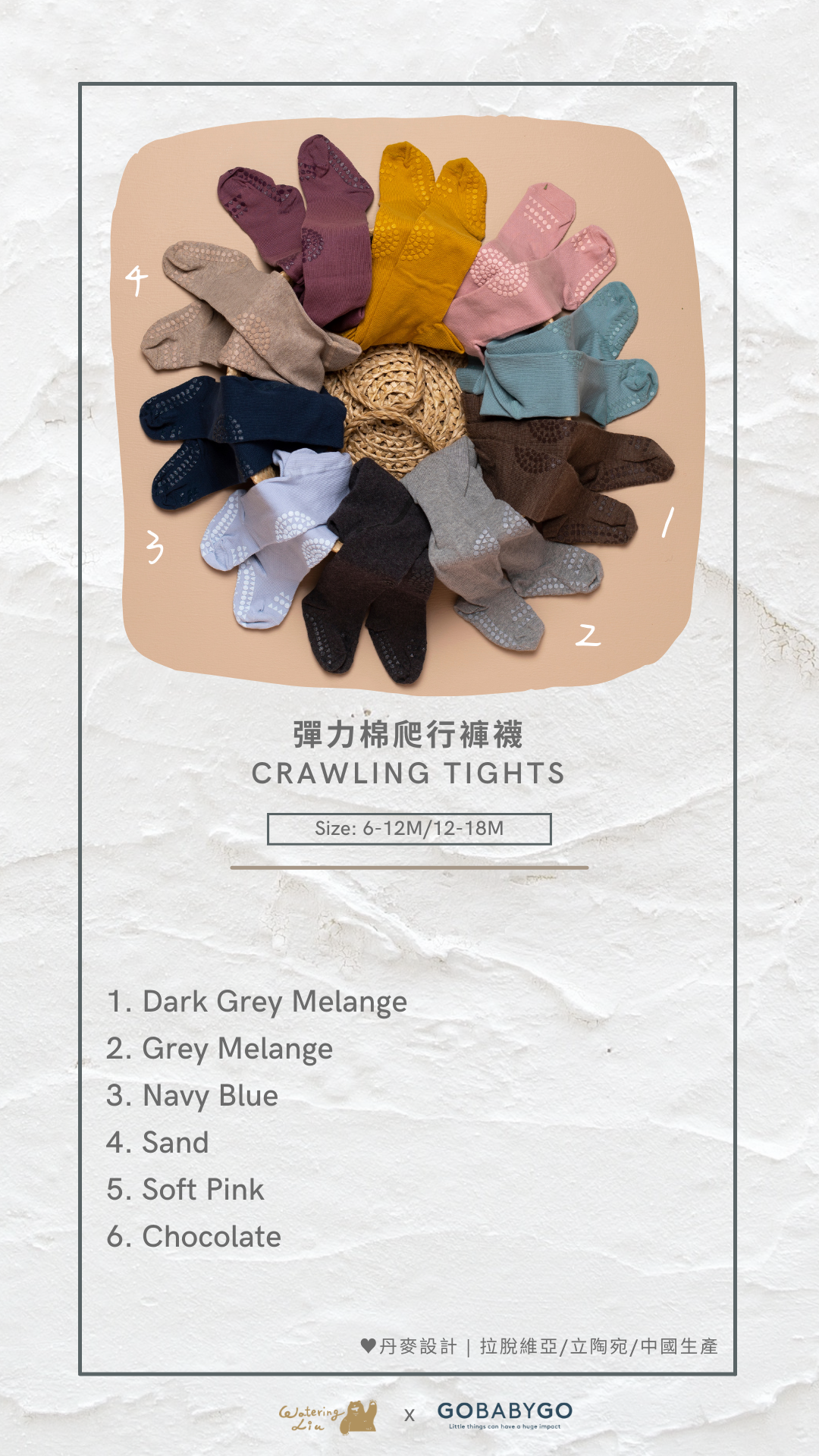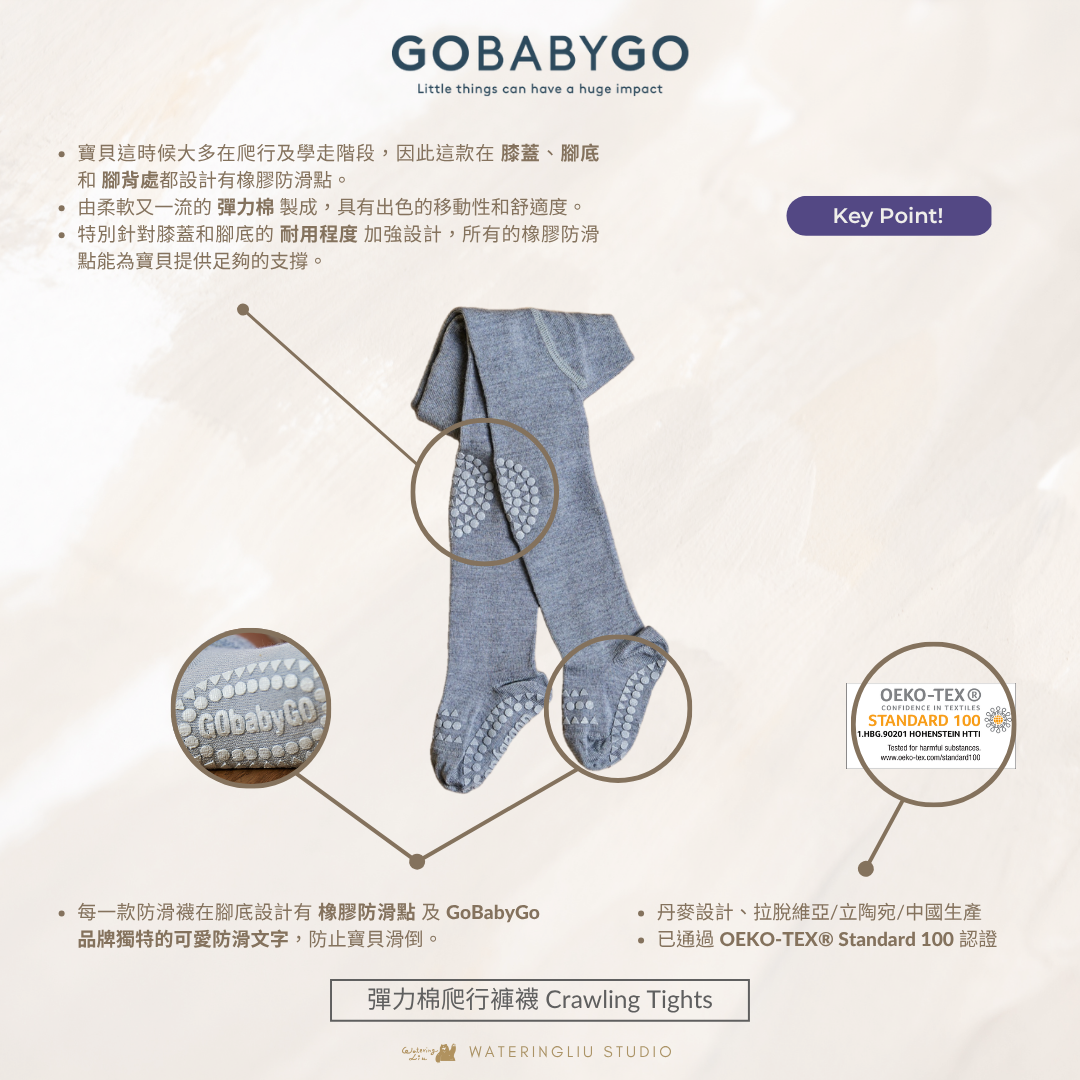 GoBabyGo 彈力棉爬行褲襪在膝蓋、腳底和腳背處都有特殊設計的橡膠防滑點,確保孩子在開始爬行和行走時不會輕易在光滑的表面上滑倒,為寶貝在所有表面上提供穩定性。