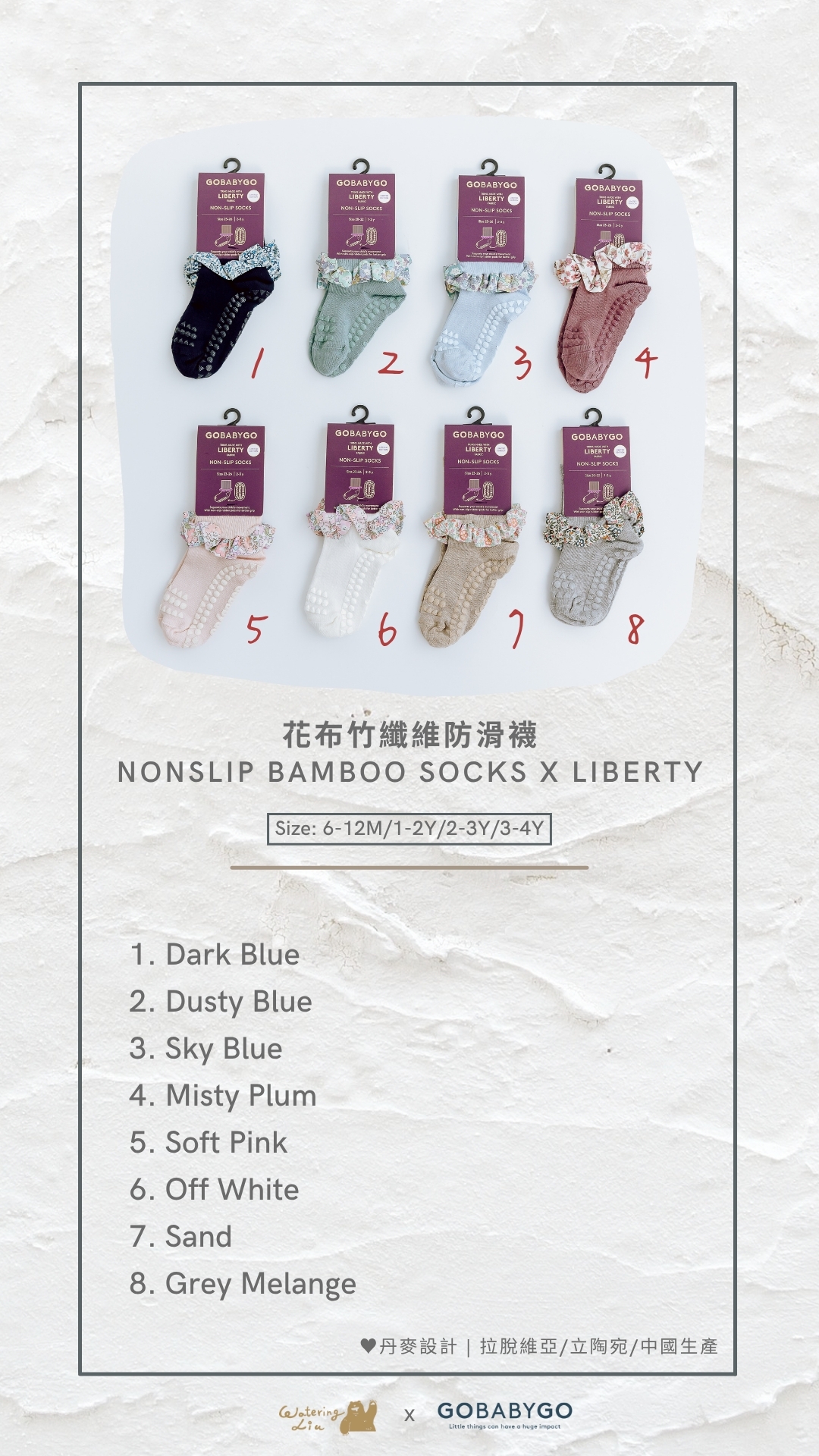 GoBabyGo 竹纖維防滑襪,腳踝處帶有美麗的 Liberty 花布點綴著,此荷葉邊花布是絲綢般柔軟的布料及獨特的印花結合而成,與超柔軟的 GoBabyGo 竹纖維襪完美搭配。