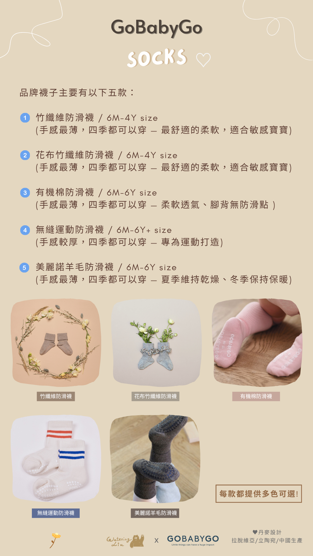 GoBabyGo 竹纖維防滑襪,其防滑襪底以及含有橡膠防滑點的設計,確保孩子在開始爬行和行走時不會輕易在光滑的表面上滑倒。