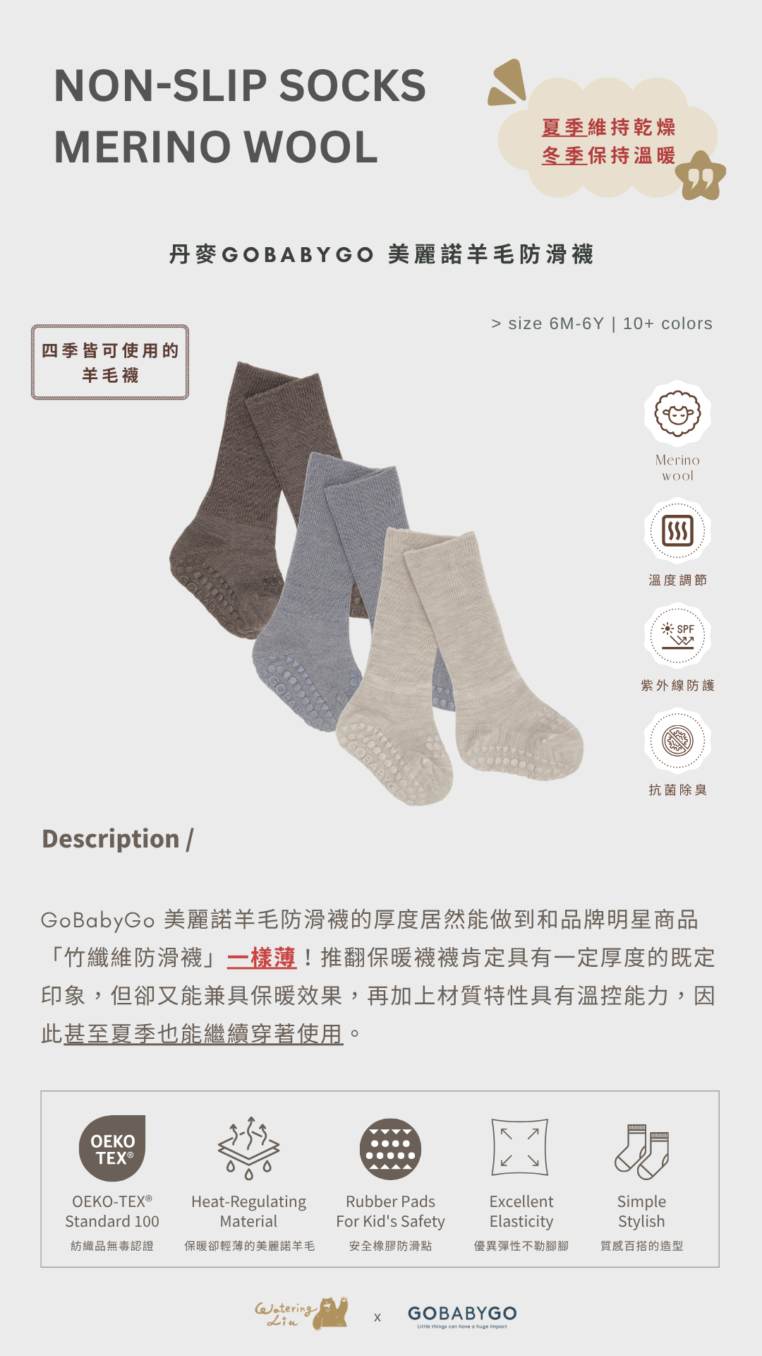 其材質彈性相比品牌的竹纖維防滑襪更是毫不遜色,其韌性及抗皺性高,更重要的是 GoBabyGo 美麗諾羊毛防滑襪的厚度居然能做到和品牌明星商品「竹纖維防滑襪」一樣薄推翻保暖襪襪肯定具有一定厚度的既定印象,但卻又能兼具保暖效果,再加上材質特性具有溫控能力,因此甚至夏季也能繼續穿著使用真的是讓我們最驚艷及大力激推的原因!