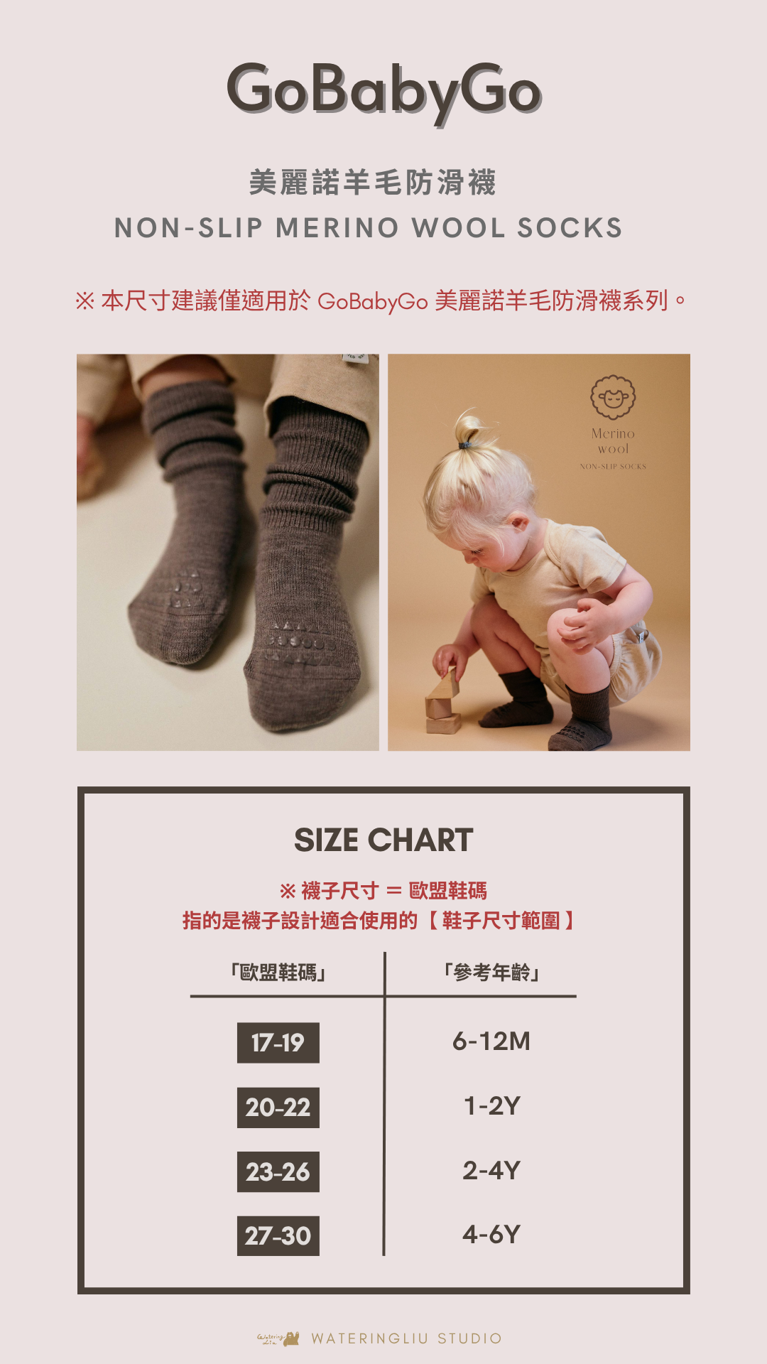 GoBabyGo 美麗諾羊毛防滑襪,其防滑襪底以及含有橡膠防滑點的設計,確保孩子在開始爬行和行走時不會輕易在光滑的表面上滑倒。