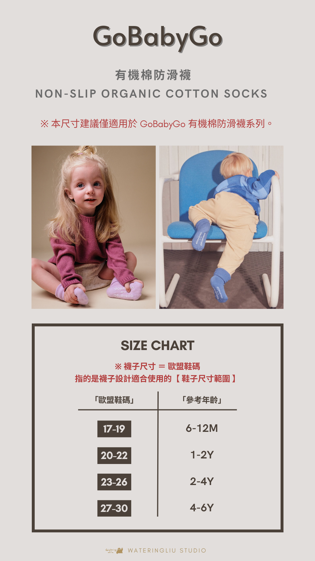GoBabyGo 有機棉防滑襪,其防滑襪底以及含有防滑點的設計,確保孩子在開始爬行和行走時不會輕易在光滑的表面上滑倒。