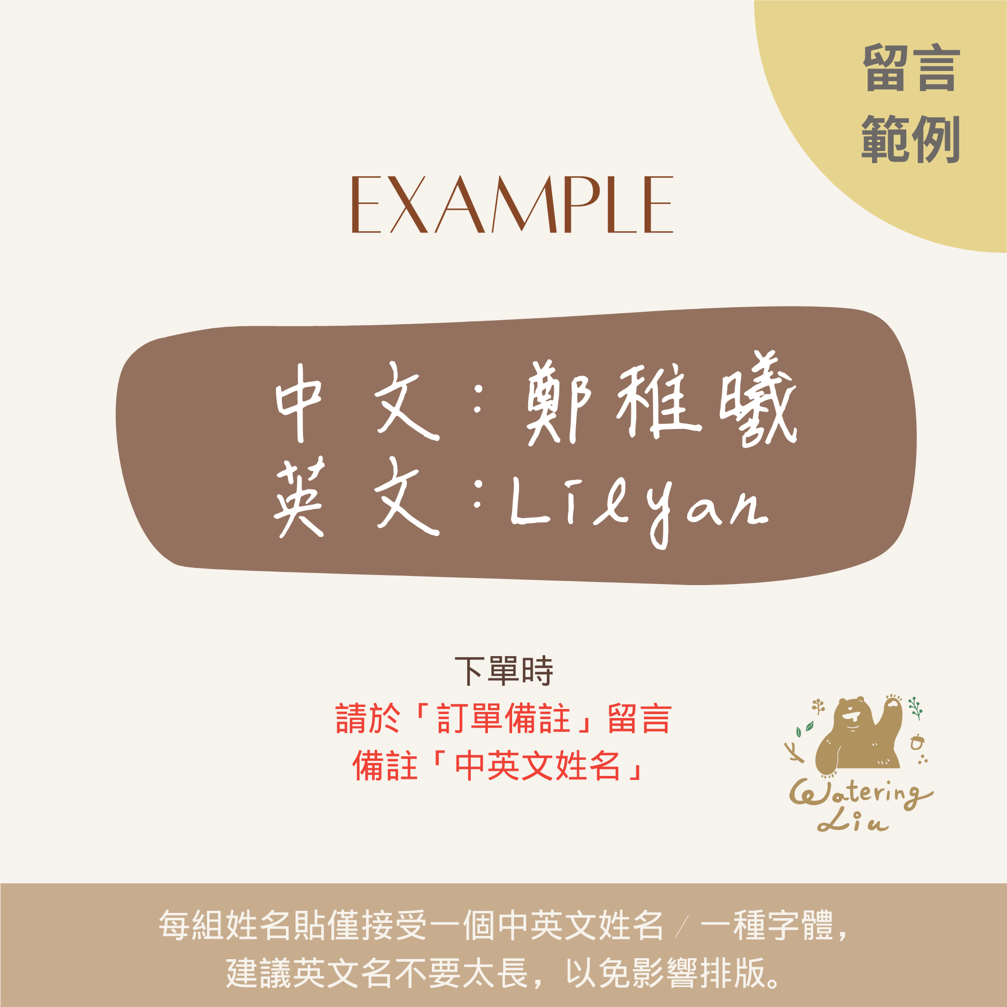 下單時,請主動於「訂單備註」留言備註「中英文姓名」,請務必將姓名文字檢查清楚(如是否有錯別字、英文大小寫等),客製化商品後續無法修改,除瑕疵外無法退換貨。