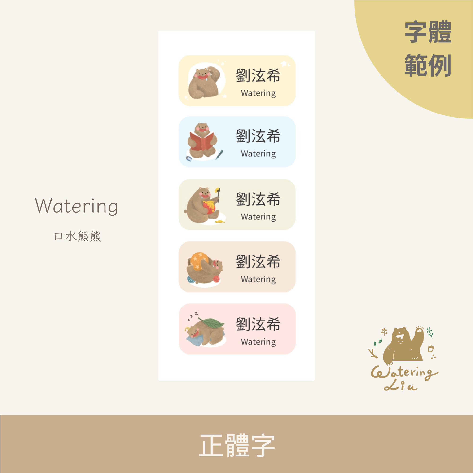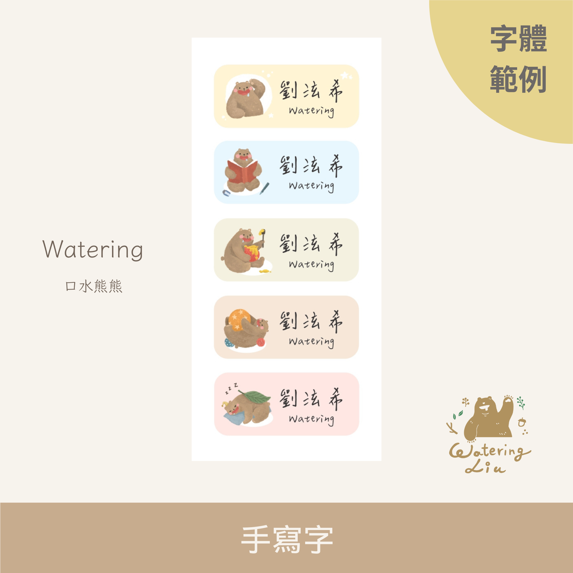 WateringLiu Studio 獨家手繪插圖|限時限定推出|質感耐高溫防水姓名貼 Name Sticker|口水熊熊 Watering 🎨