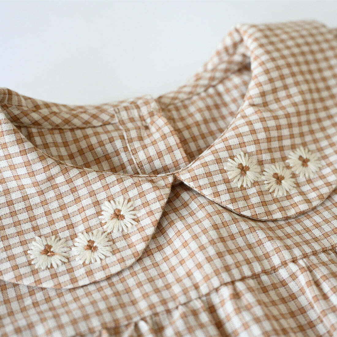 迷人的連身洋裝,衣領上裝飾有小雛菊的精緻刺繡。