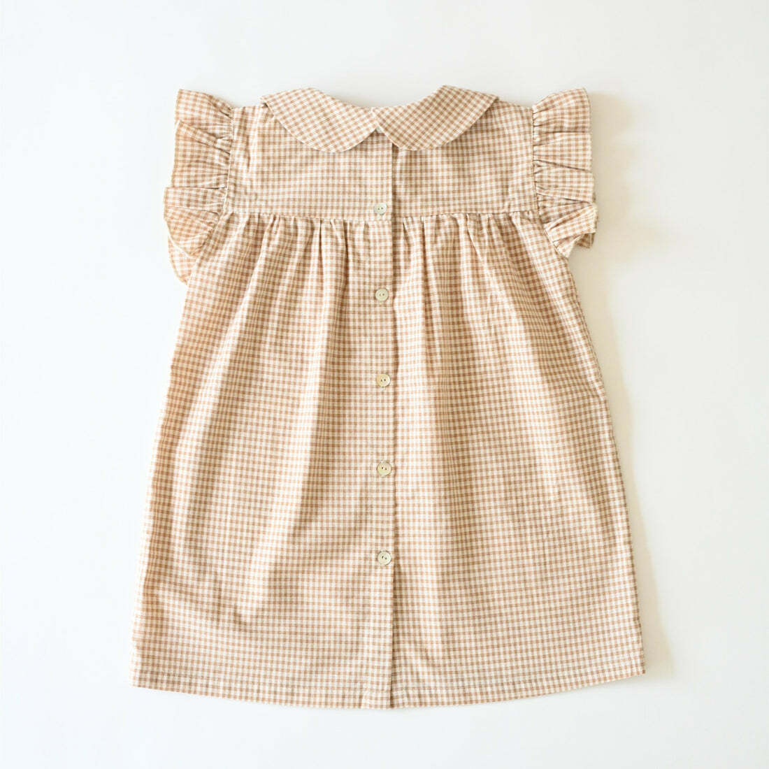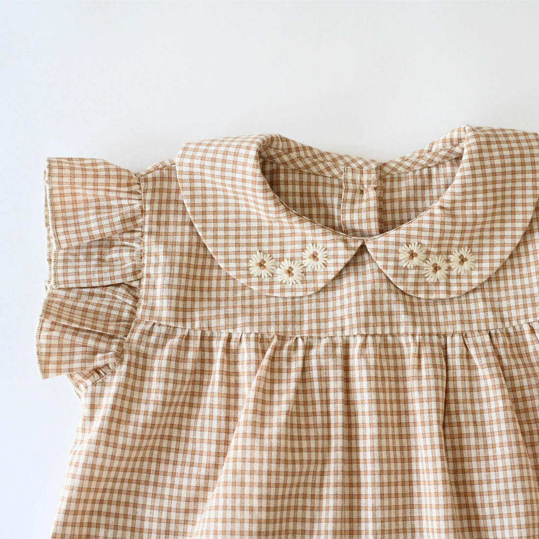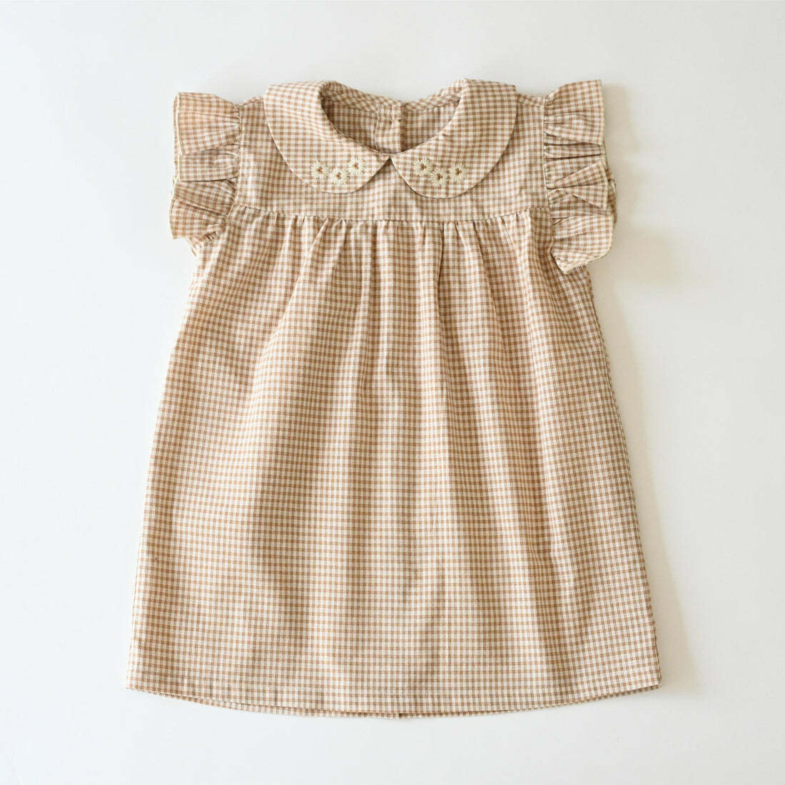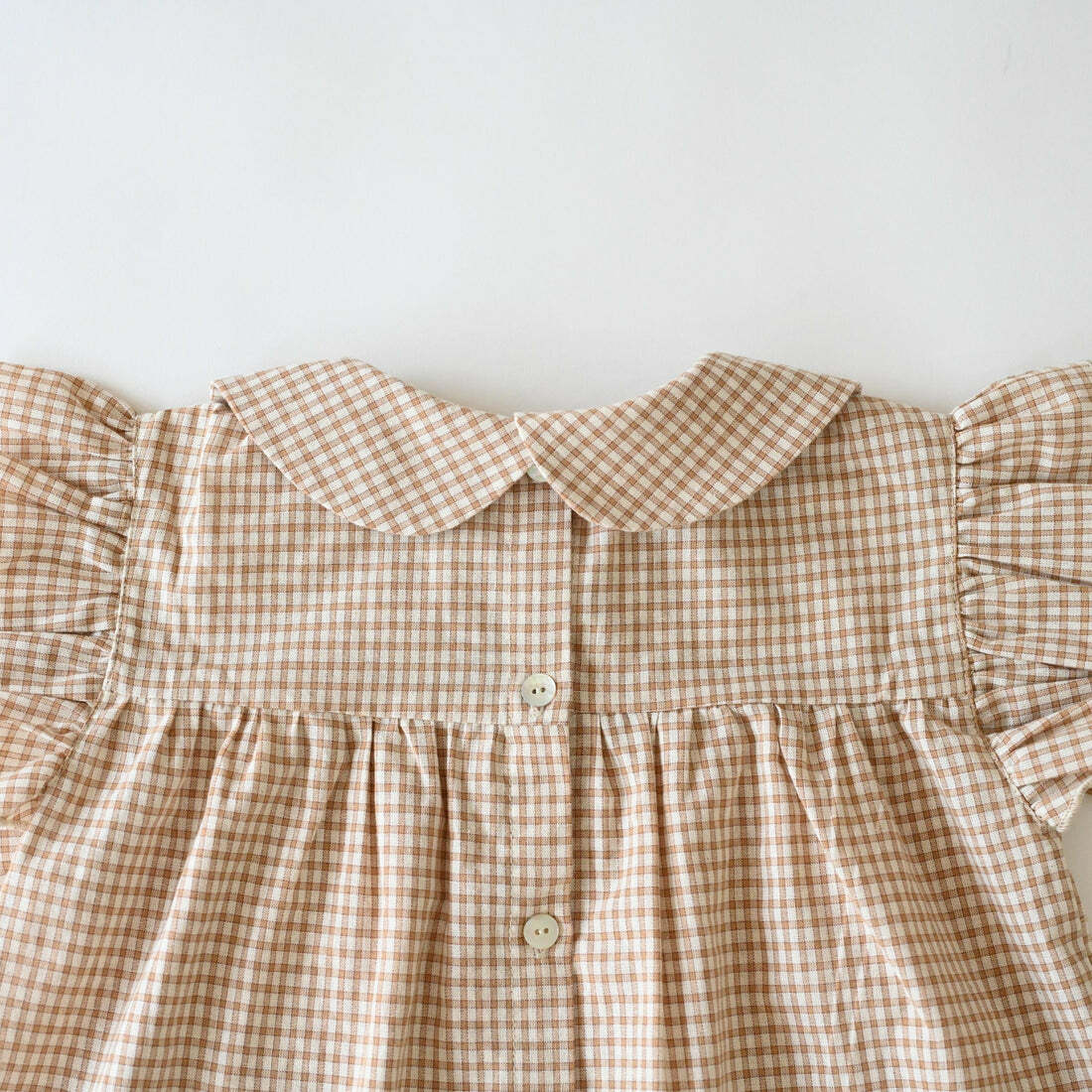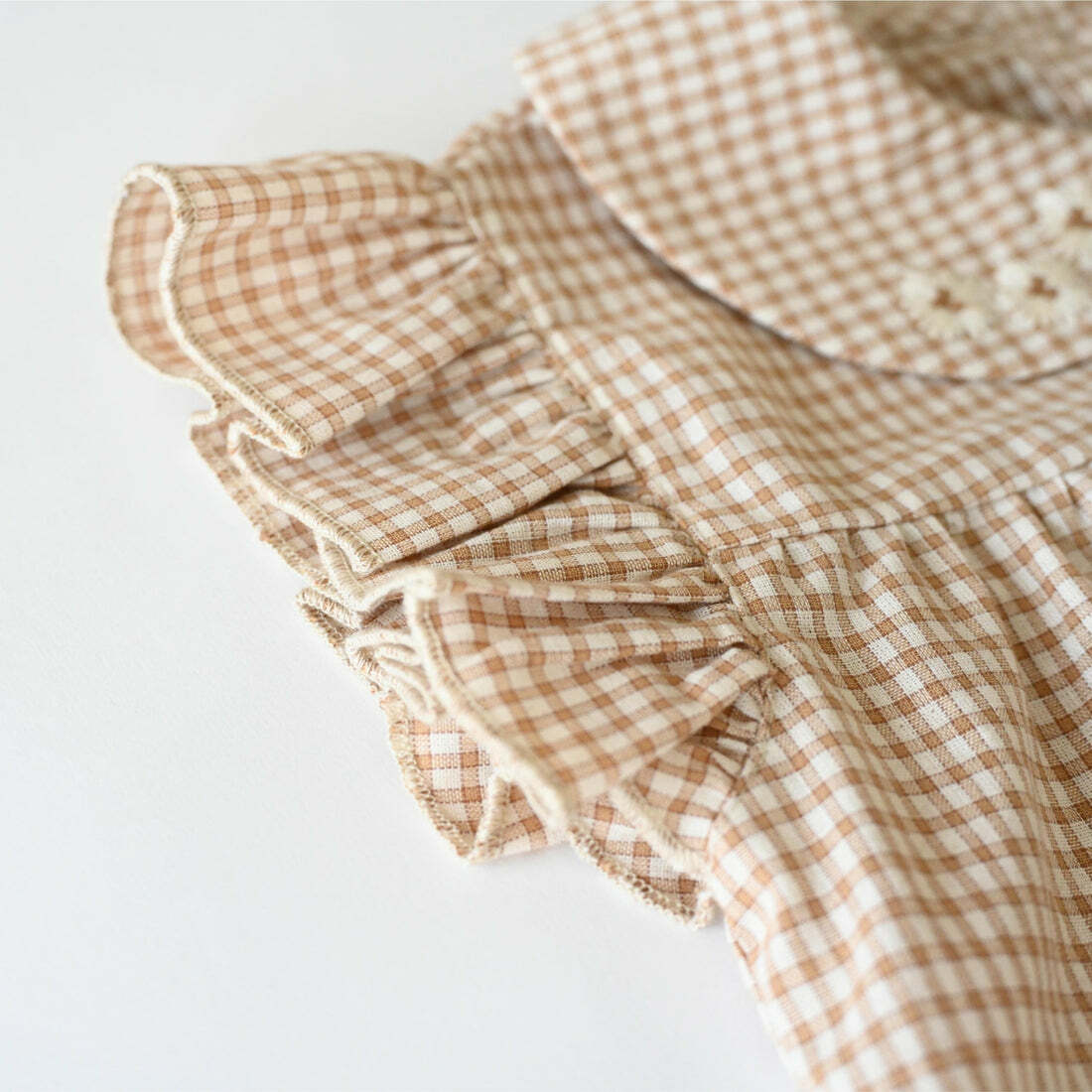 布料採用類似 PETITMIG 聞名的棕色格紋製成,荷葉褶邊的小飛袖更帶有一種可愛的感覺。