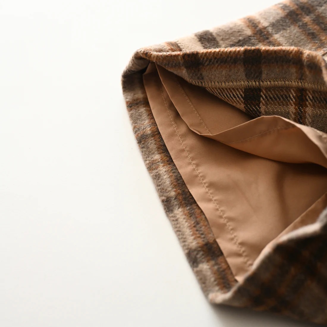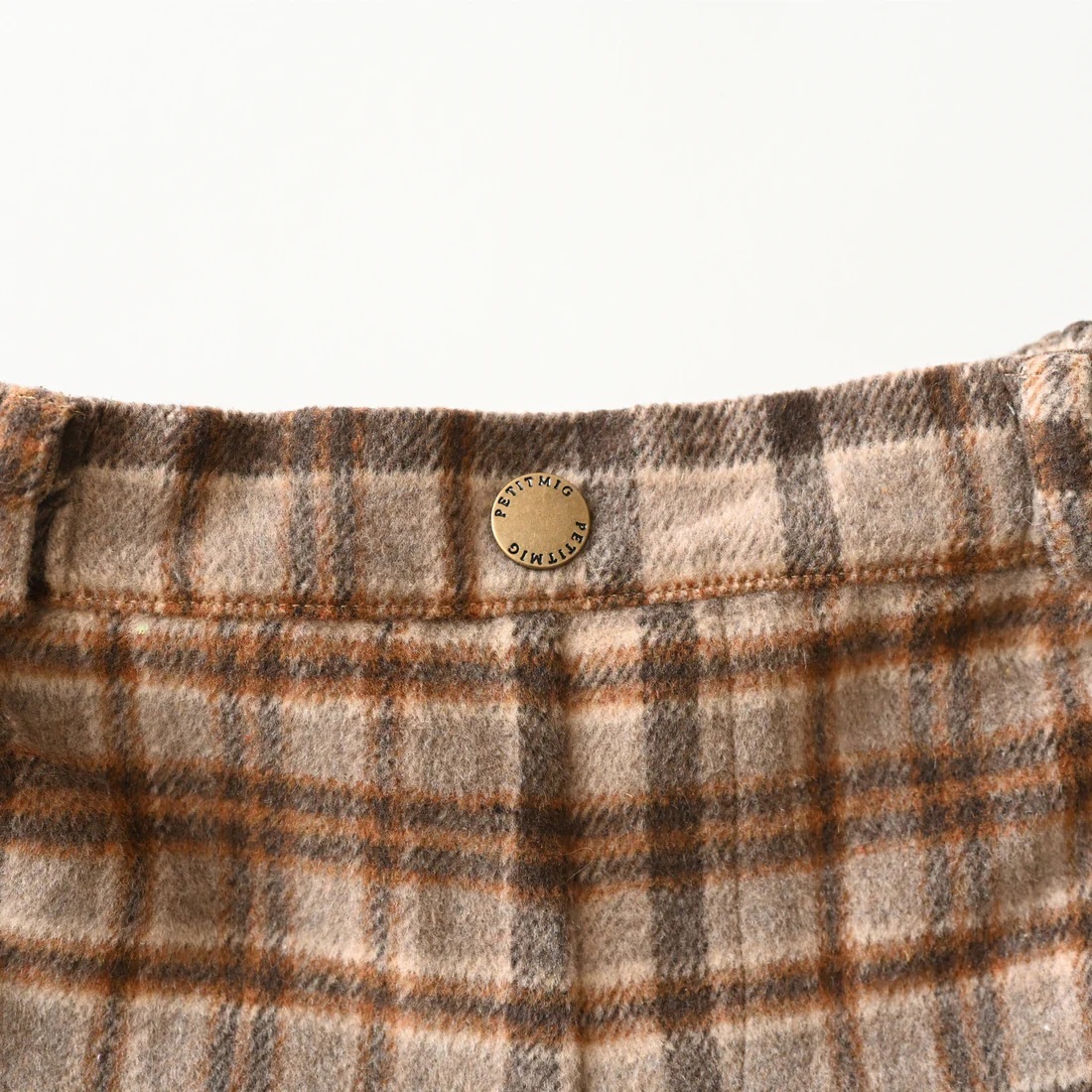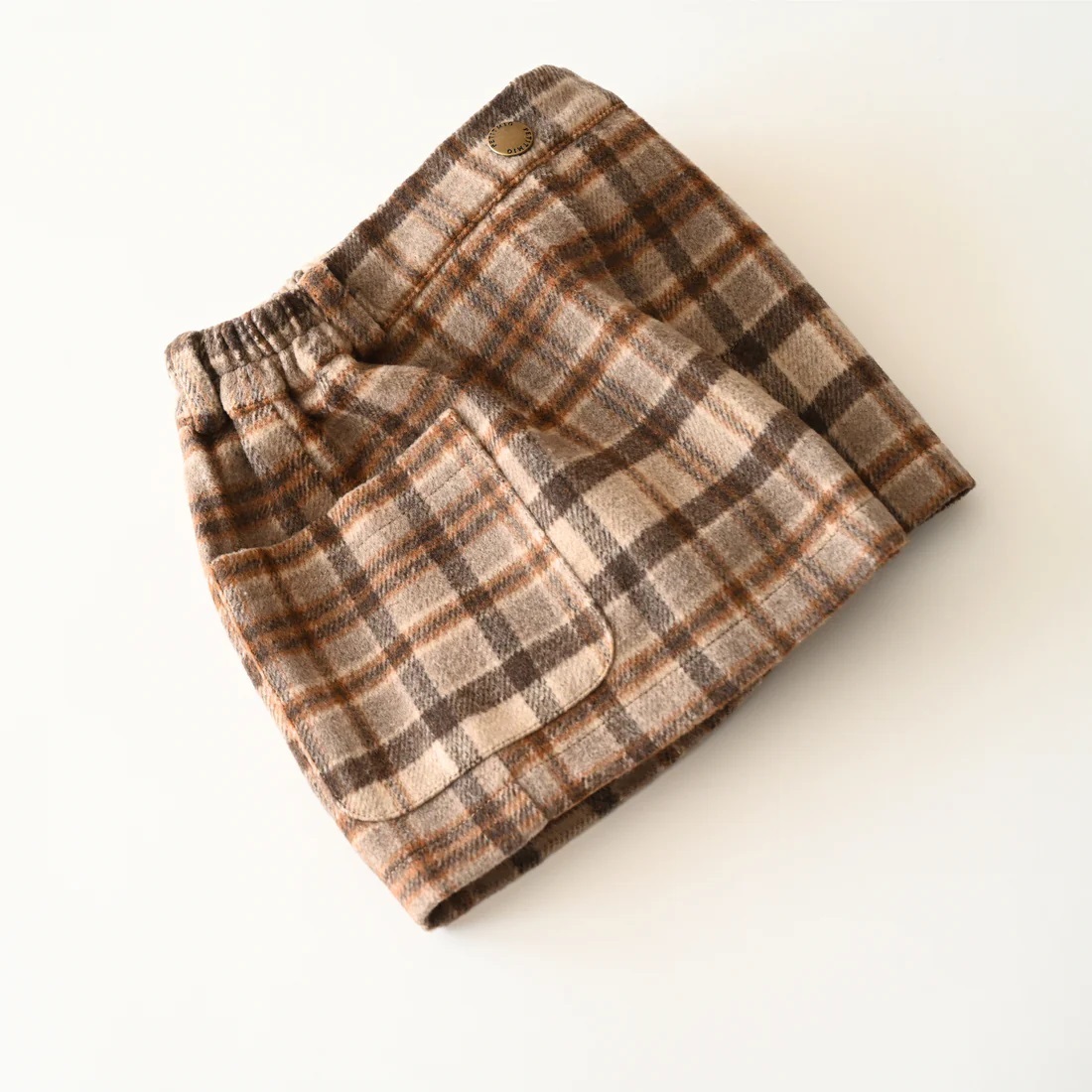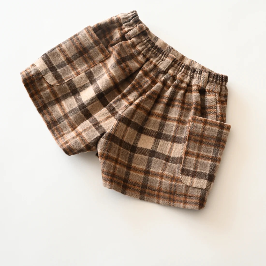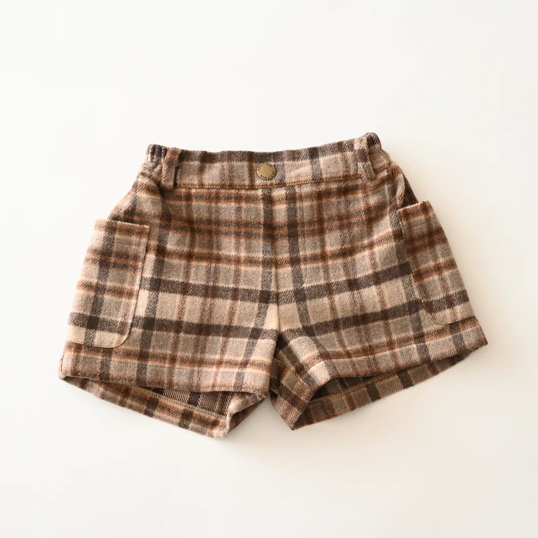 Shorts featuring a large plaid pattern in autumn/winter colors. Made of wool blend material to keep you warm. It has large pockets that kids will love, and a soft lining that puts comfort first. Antique gold snap buttons add a subtle sense of luxury. Pair it with tights or knee socks for a fashionable look unique to fall and winter.